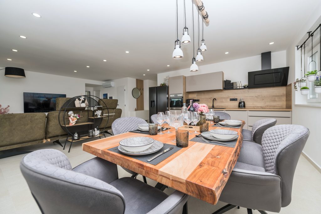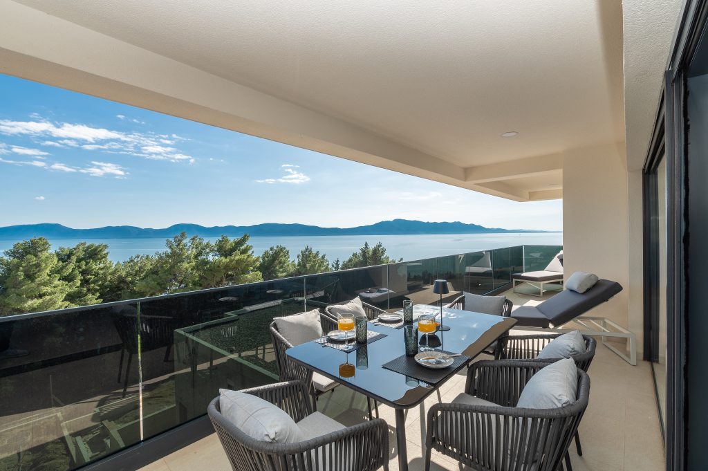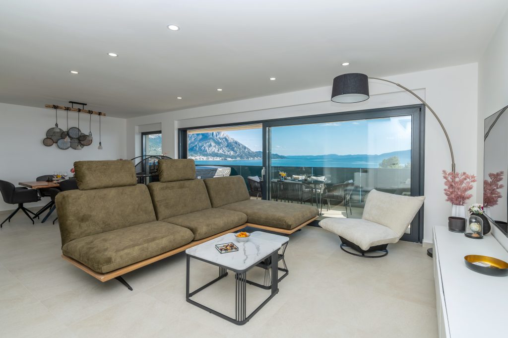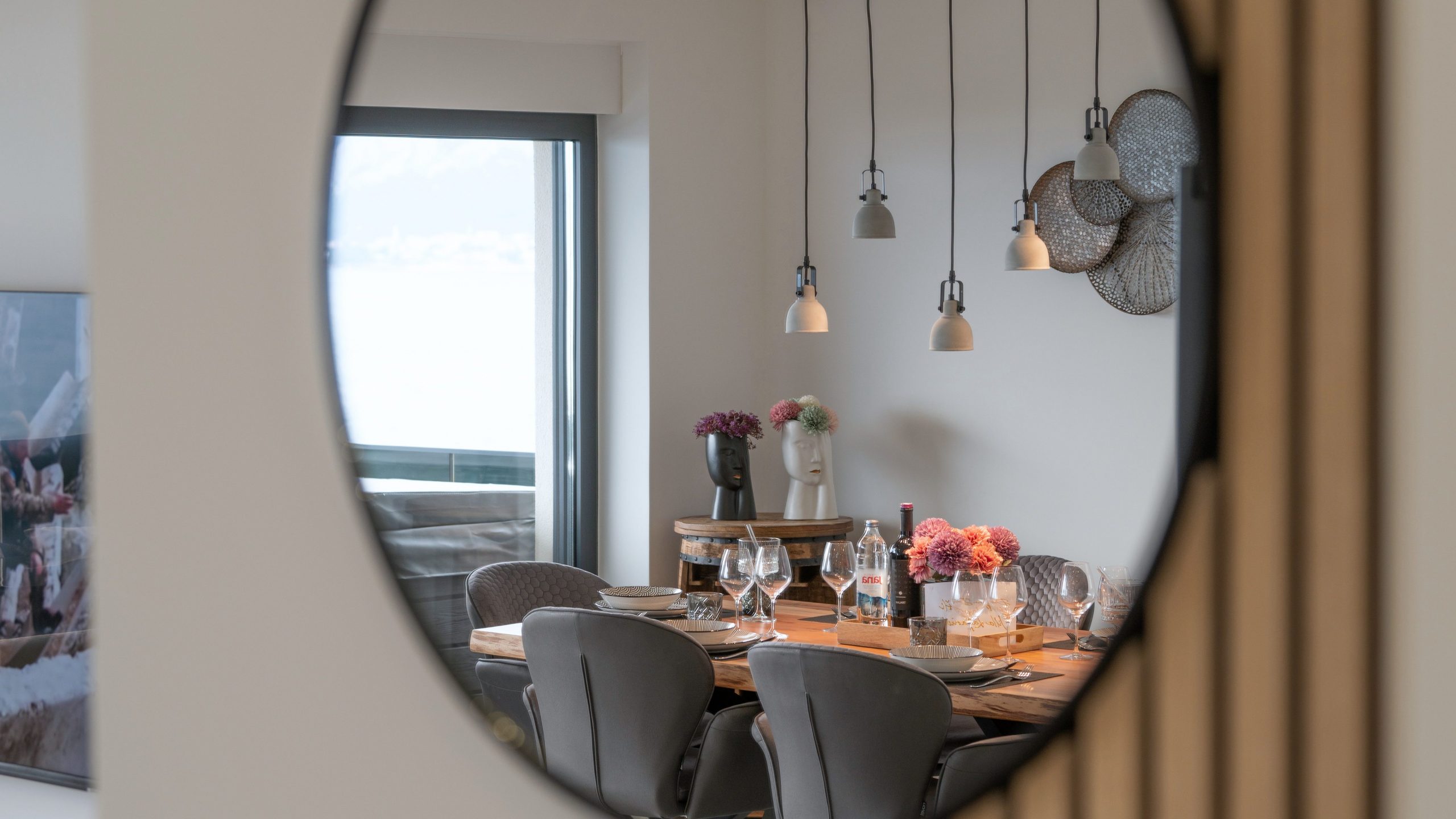 Die großzügigen Glasfronten durchfluten den Wohnbereich mit natürlichem Licht und die geräumige 30 Quadratmeter große und überdachte Terrasse, die mit einem luxuriösen Jacuzzi ausgestattet ist, ermöglicht es Ihnen den Tag mit einem Gläschen Wein ausklingen zu lassen und die Schönheit der Umgebung in vollen Zügen zu genießen. Das Herzstück der Wohnung bildet das geräumige Wohnzimmer mit einem eleganten Essbereich.