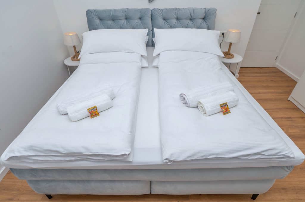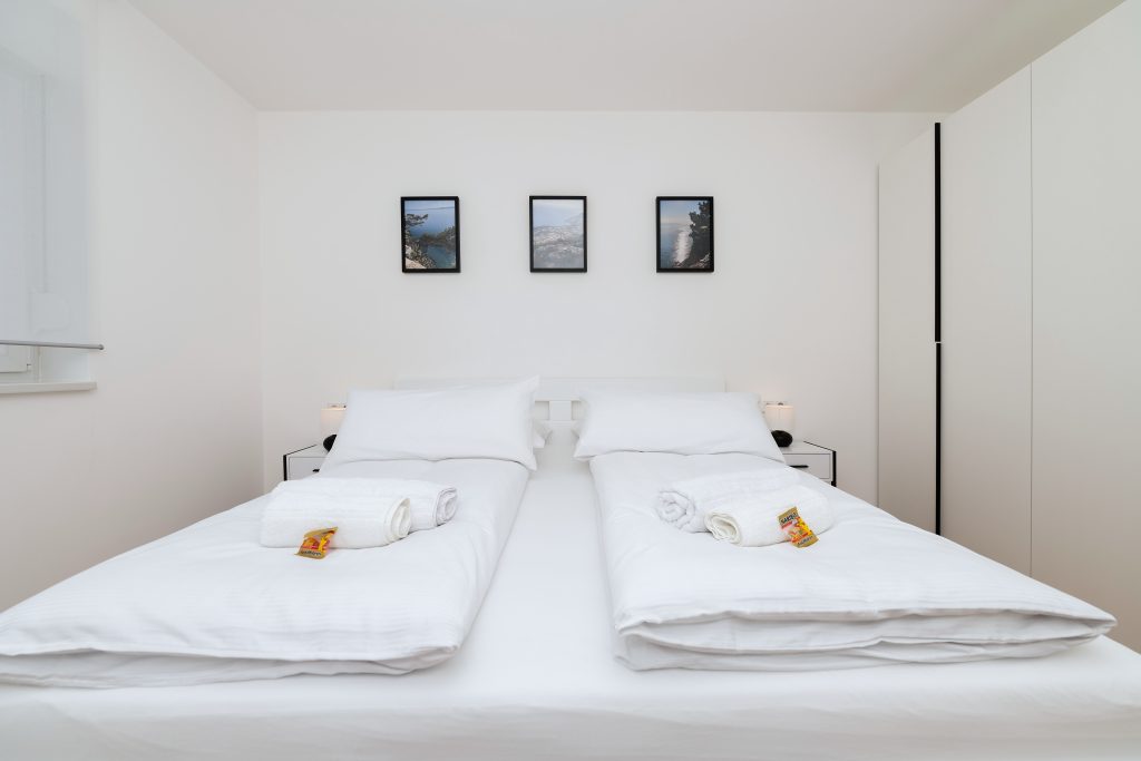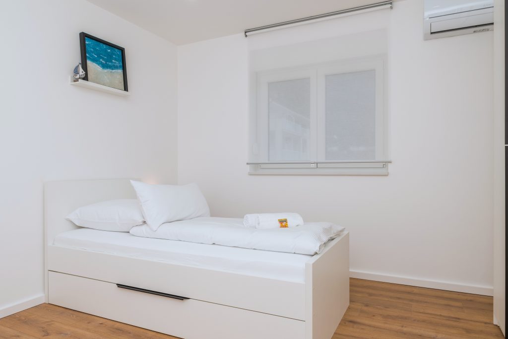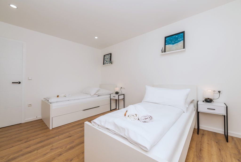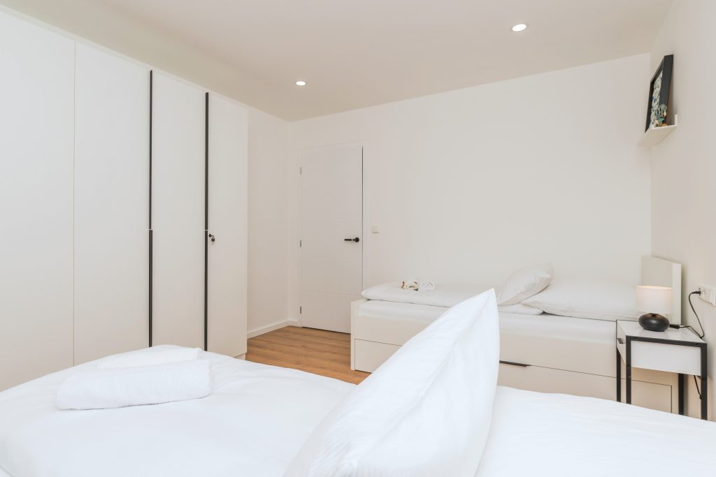 Das dritte Schlafzimmer ist ebenfalls mit einem Kleiderschrank ausgestattet und verfügt über zwei Einzelbetten, von denen eines ausziehbar ist und eine zusätzliche Schlafmöglichkeit bietet.