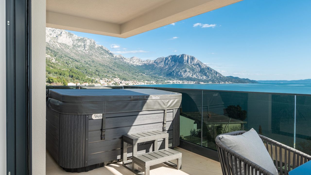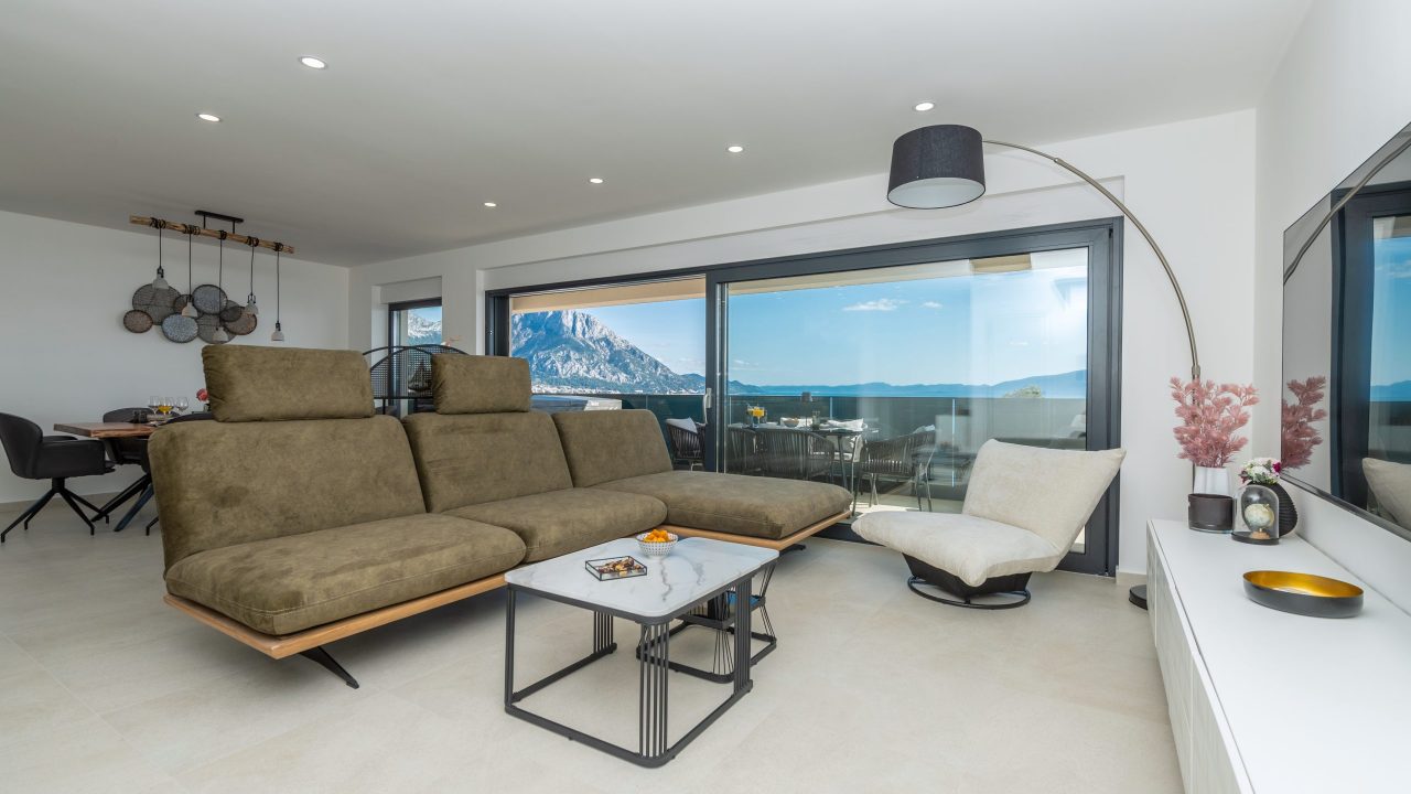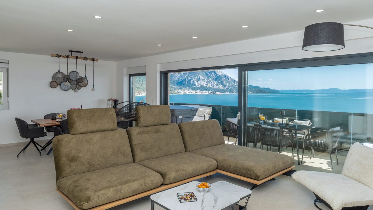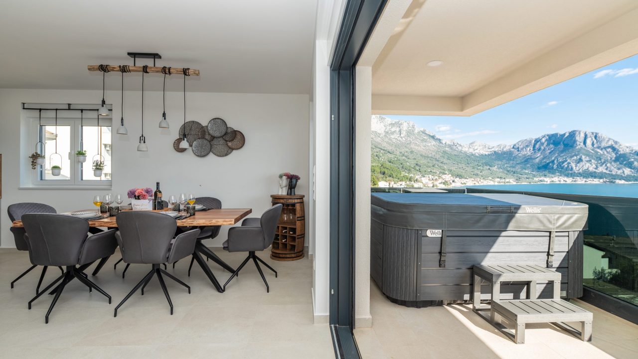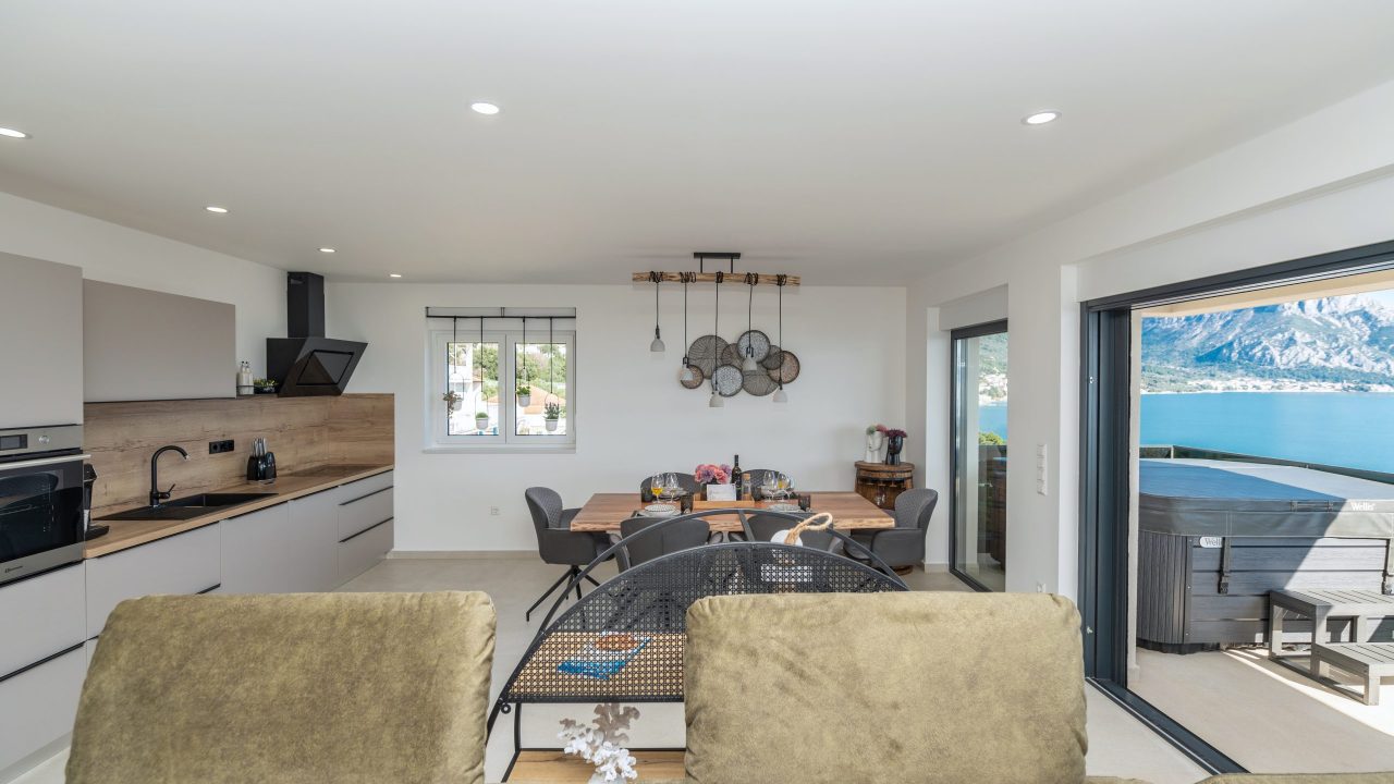 Die großzügigen Glasfronten durchfluten den Wohnbereich mit natürlichem Licht und die geräumige 30 Quadratmeter große und überdachte Terrasse, die mit einem luxuriösen Jacuzzi ausgestattet ist, ermöglicht es Ihnen den Tag mit einem Gläschen Wein ausklingen zu lassen und die Schönheit der Umgebung in vollen Zügen zu genießen. Das Herzstück der Wohnung bildet das geräumige Wohnzimmer mit einem eleganten Essbereich.
