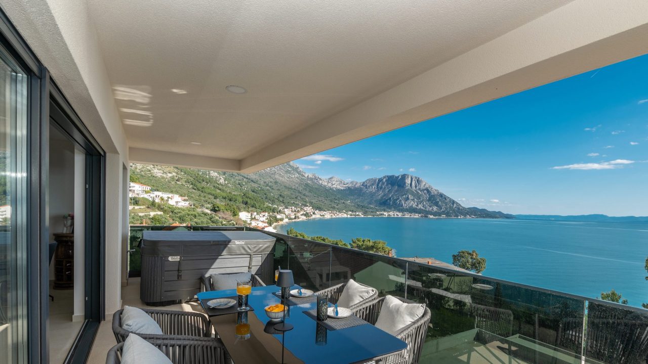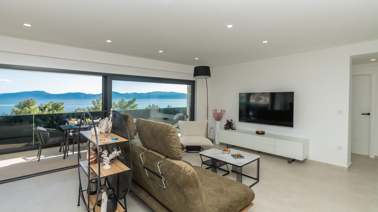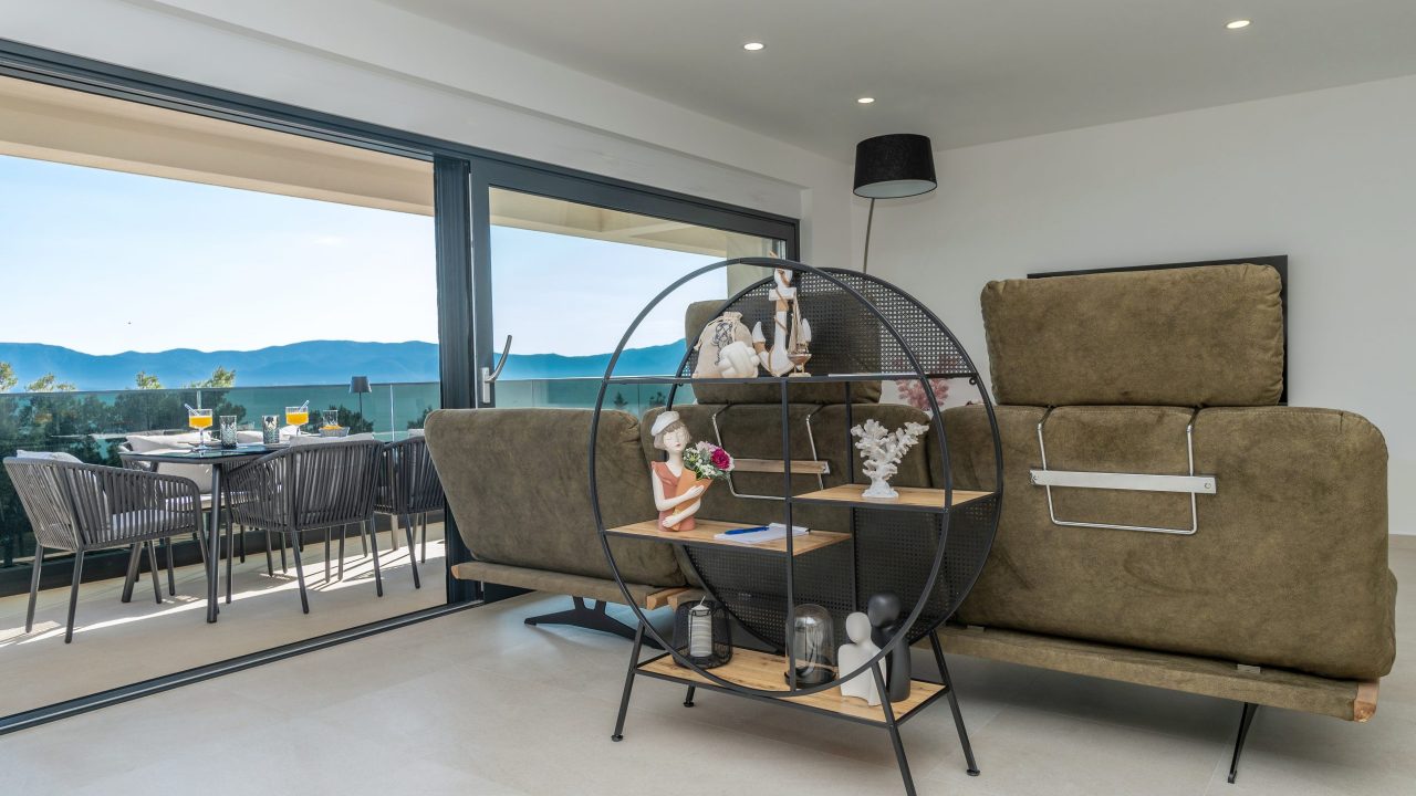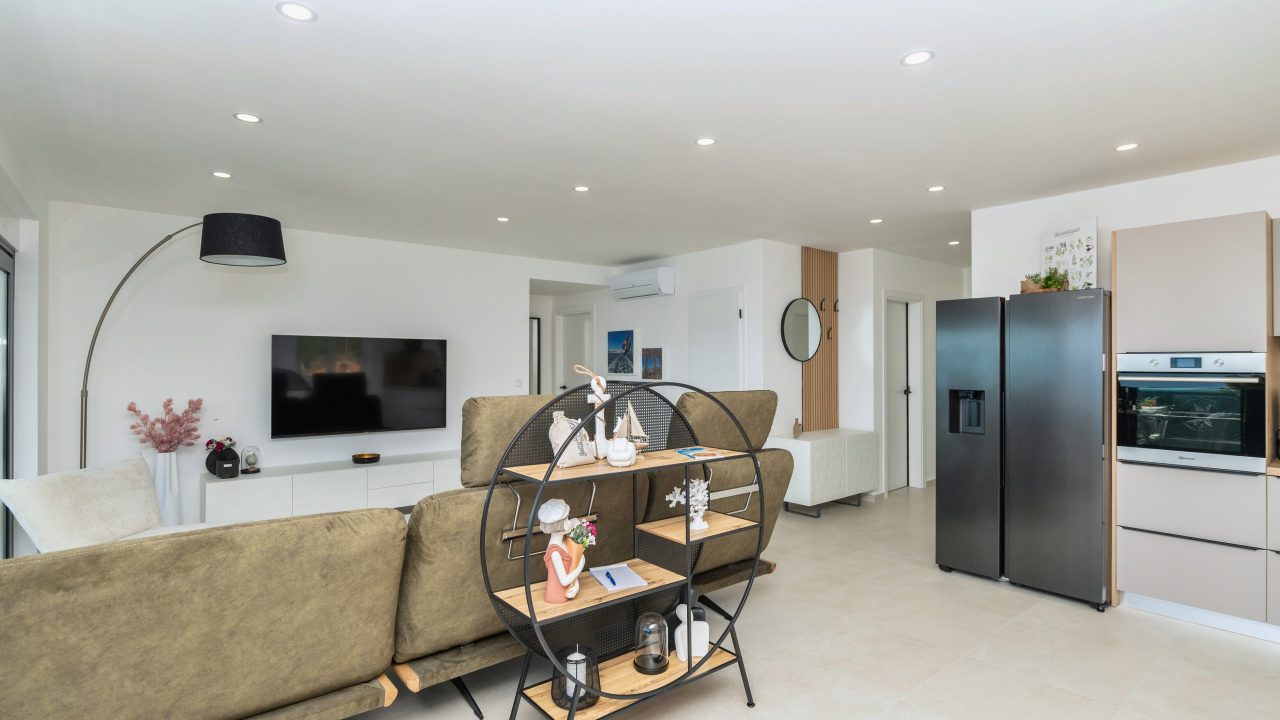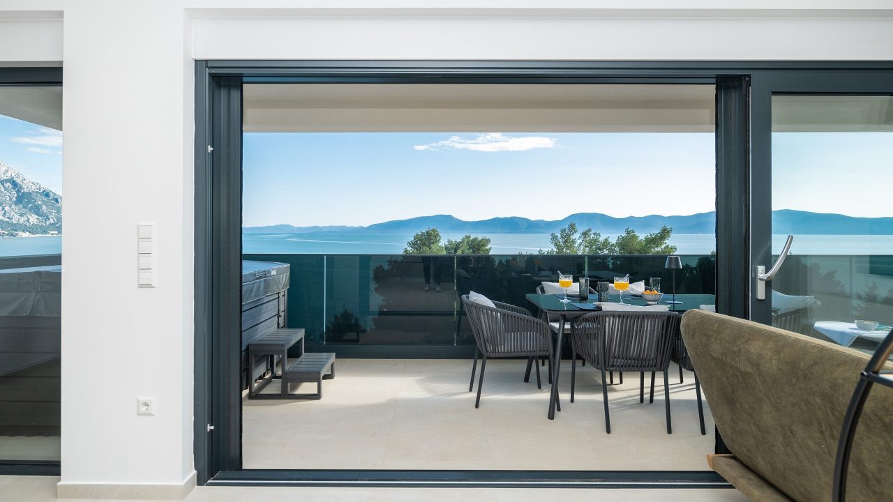 Die großzügigen Glasfronten durchfluten den Wohnbereich mit natürlichem Licht und die geräumige 30 Quadratmeter große und überdachte Terrasse, die mit einem luxuriösen Jacuzzi ausgestattet ist, ermöglicht es Ihnen den Tag mit einem Gläschen Wein ausklingen zu lassen und die Schönheit der Umgebung in vollen Zügen zu genießen. Das Herzstück der Wohnung bildet das geräumige Wohnzimmer mit einem eleganten Essbereich.