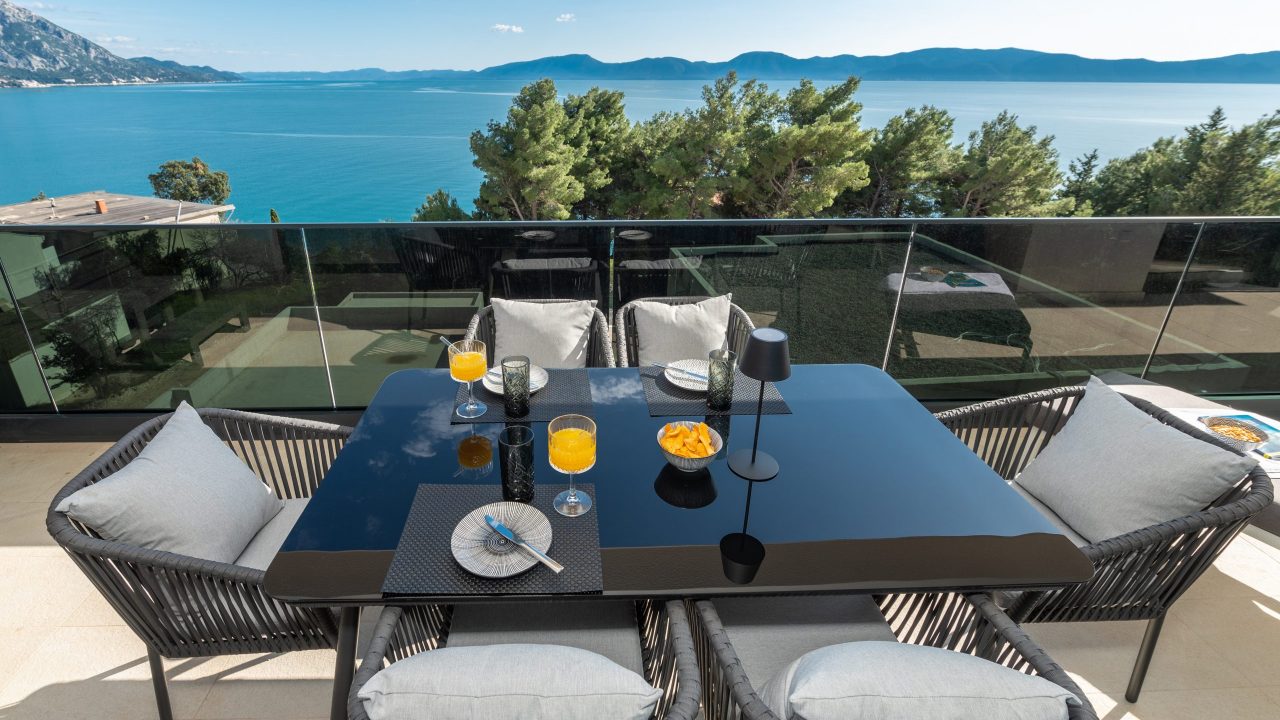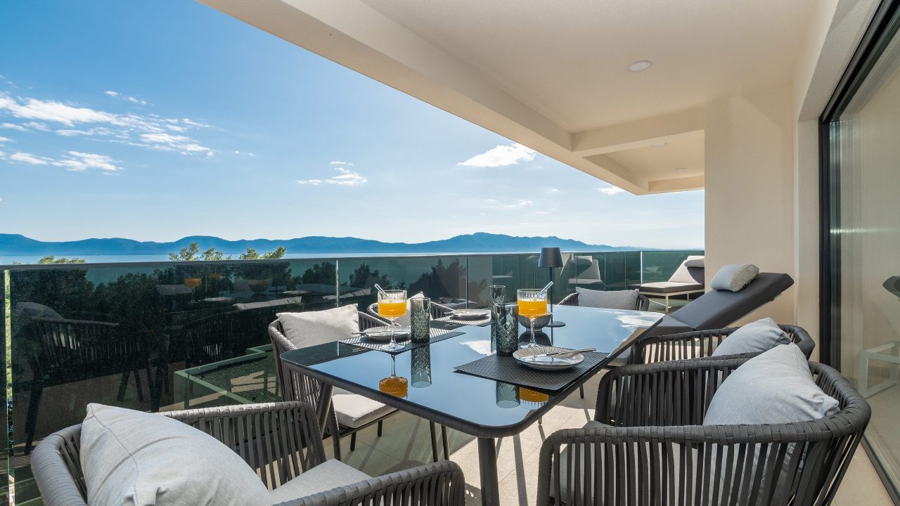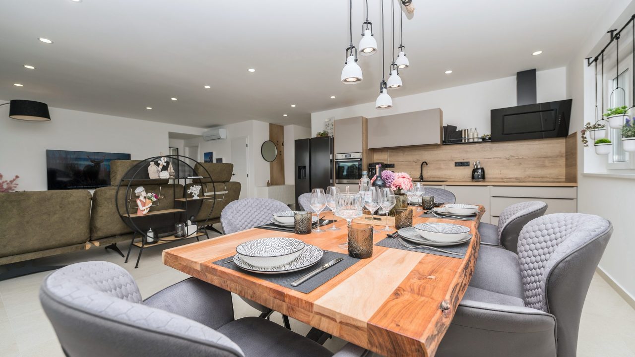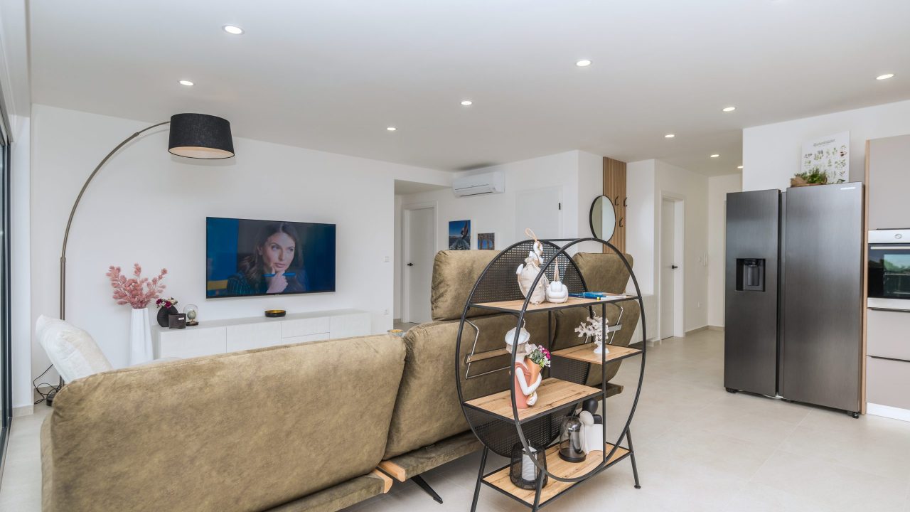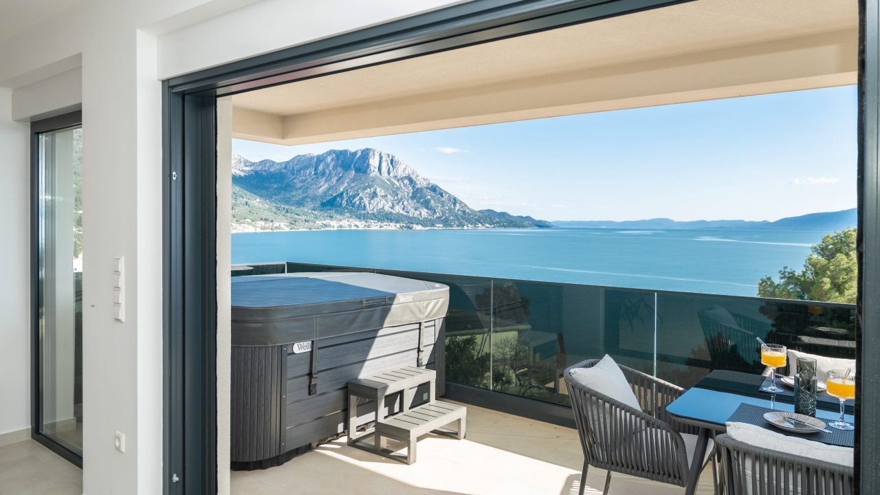 Die großzügigen Glasfronten durchfluten den Wohnbereich mit natürlichem Licht und die geräumige 30 Quadratmeter große und überdachte Terrasse, die mit einem luxuriösen Jacuzzi ausgestattet ist, ermöglicht es Ihnen den Tag mit einem Gläschen Wein ausklingen zu lassen und die Schönheit der Umgebung in vollen Zügen zu genießen. Das Herzstück der Wohnung bildet das geräumige Wohnzimmer mit einem eleganten Essbereich.