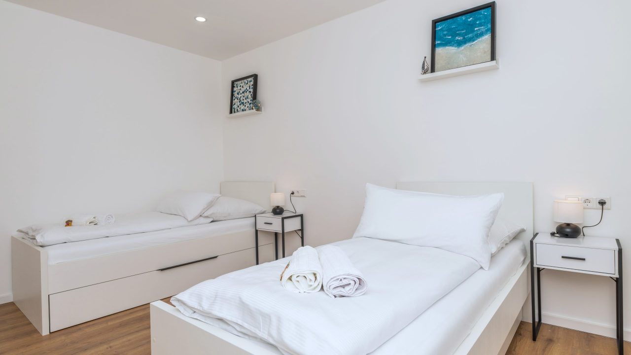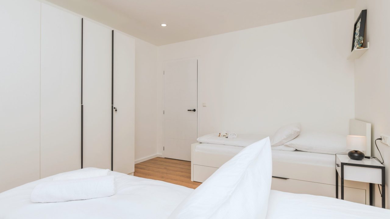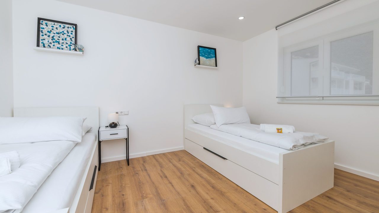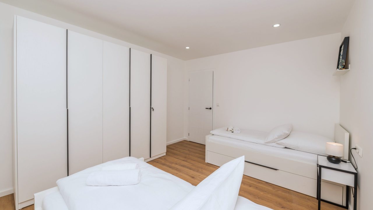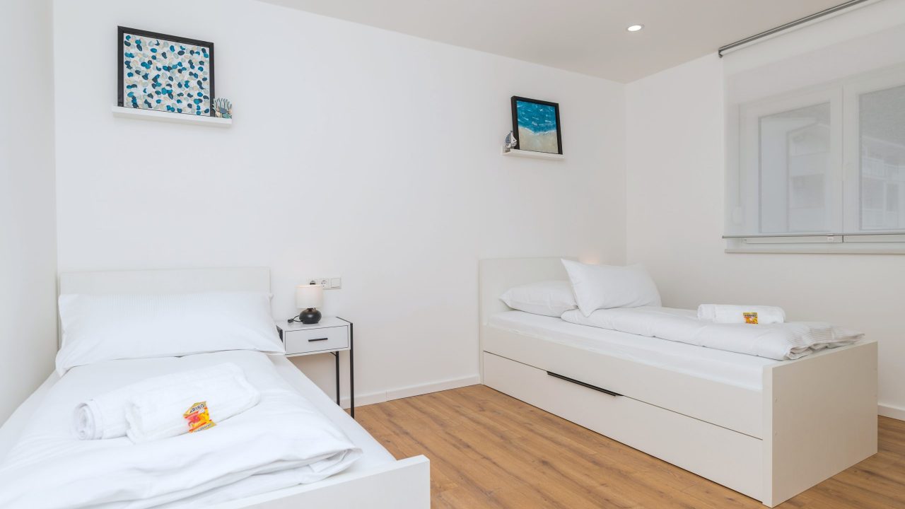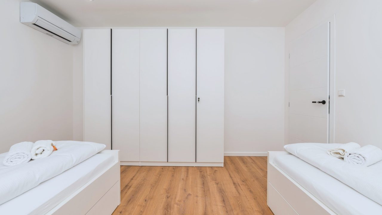 Das dritte Schlafzimmer ist ebenfalls mit einem Kleiderschrank ausgestattet und verfügt über zwei Einzelbetten, von denen eines ausziehbar ist und eine zusätzliche Schlafmöglichkeit bietet.