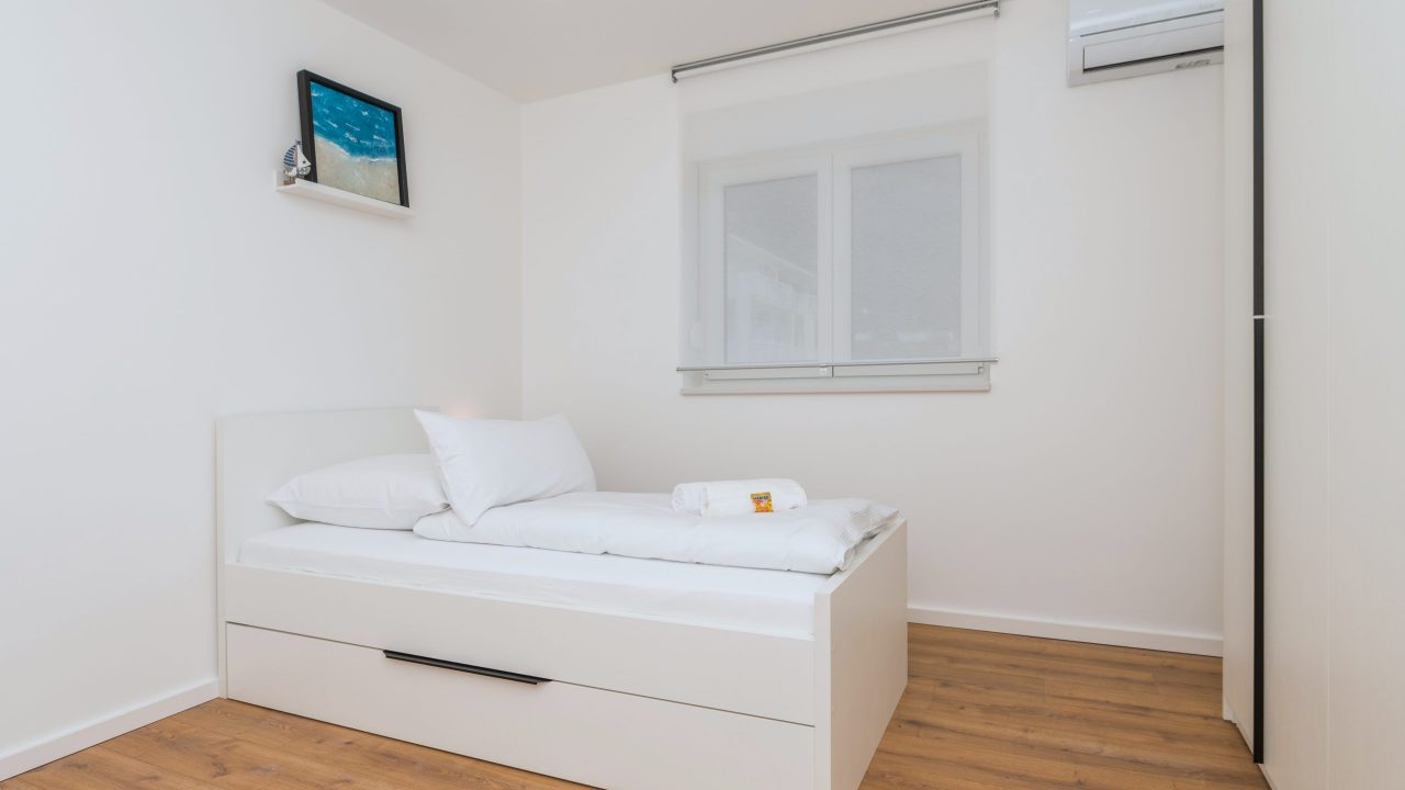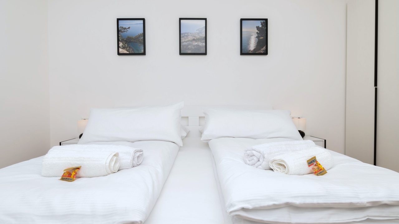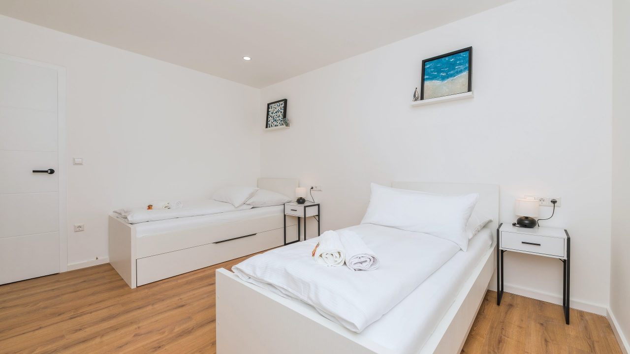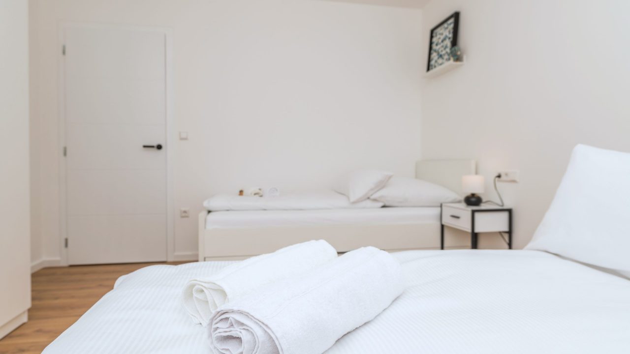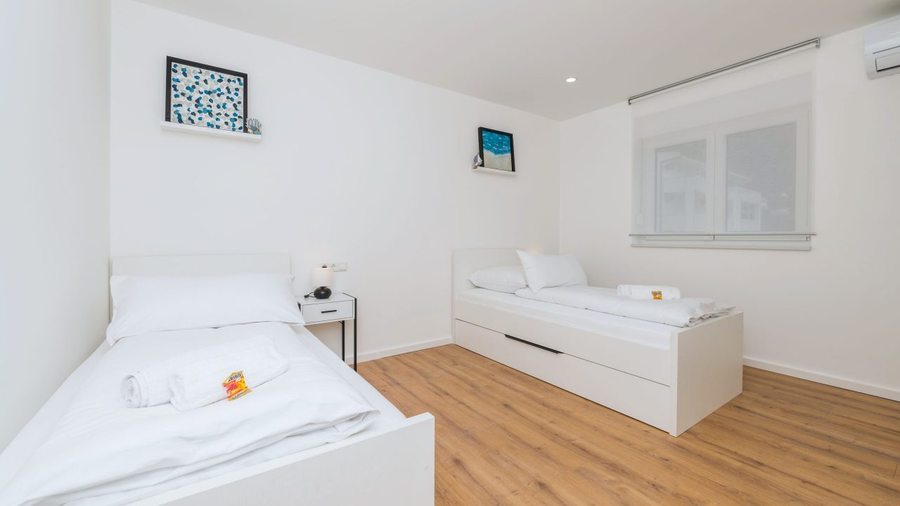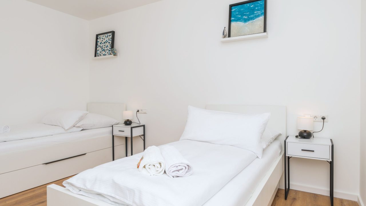 Das dritte Schlafzimmer ist ebenfalls mit einem Kleiderschrank ausgestattet und verfügt über zwei Einzelbetten, von denen eines ausziehbar ist und eine zusätzliche Schlafmöglichkeit bietet.