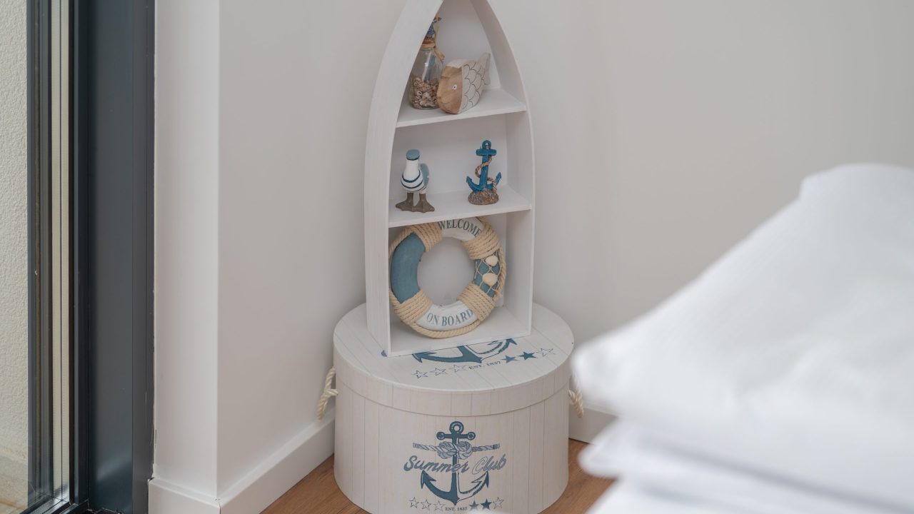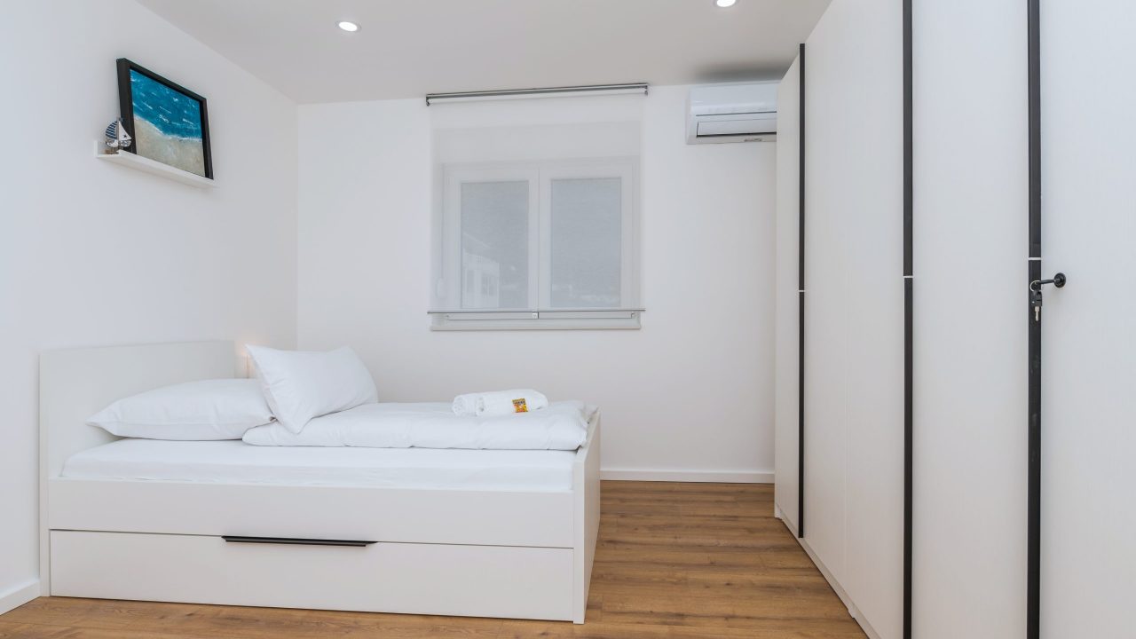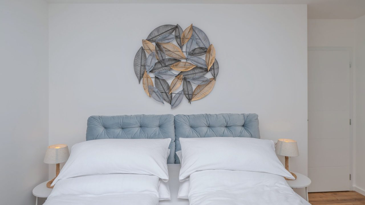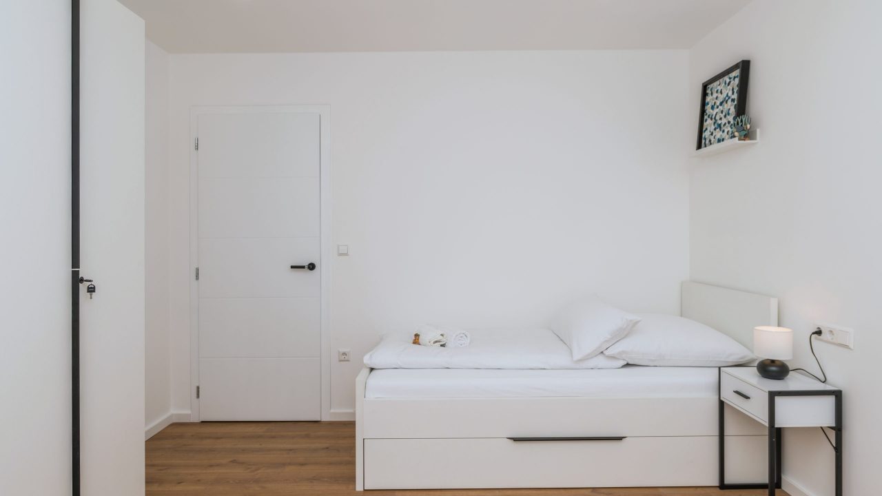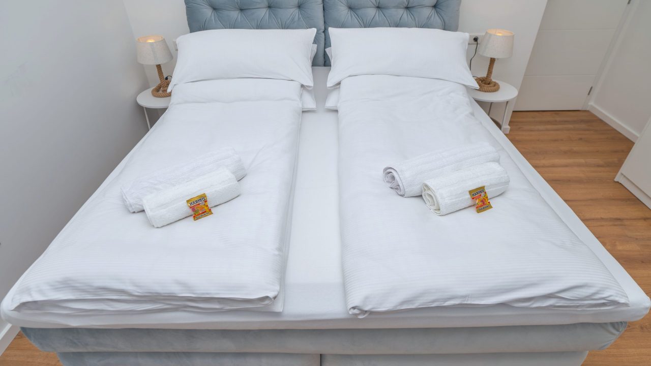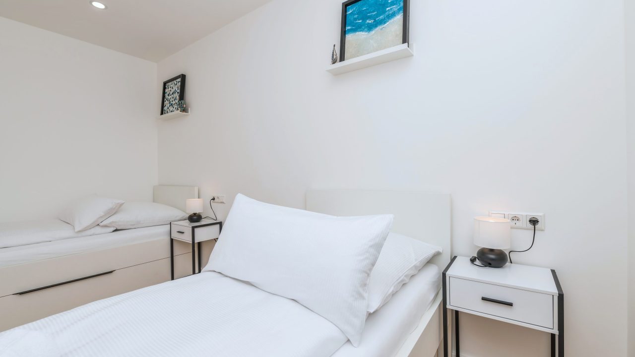 Das dritte Schlafzimmer ist ebenfalls mit einem Kleiderschrank ausgestattet und verfügt über zwei Einzelbetten, von denen eines ausziehbar ist und eine zusätzliche Schlafmöglichkeit bietet.
