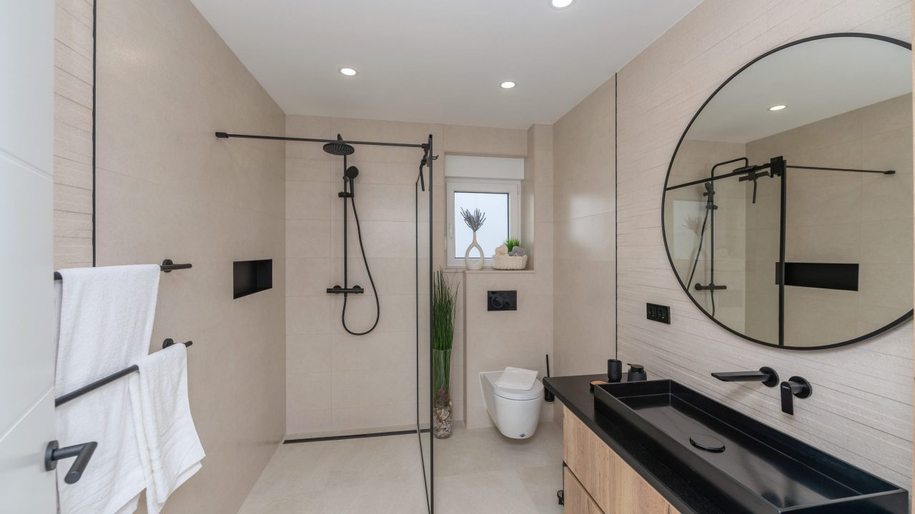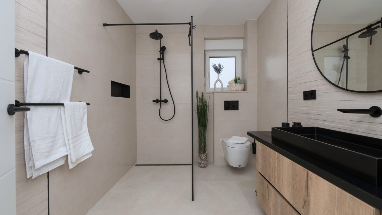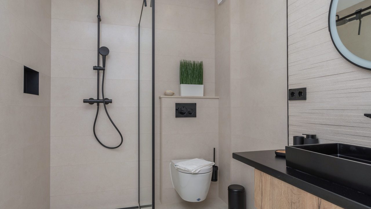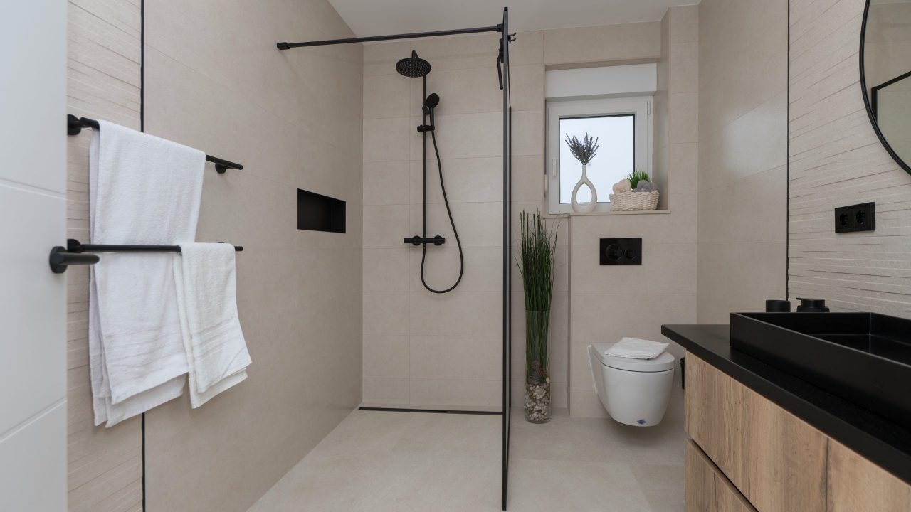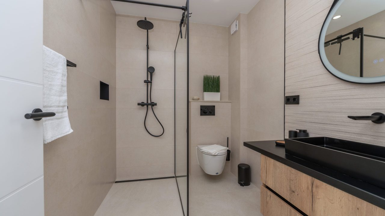 Die beiden modernen Badezimmer sind mit begehbaren Duschen ausgestattet und bieten höchsten Komfort.